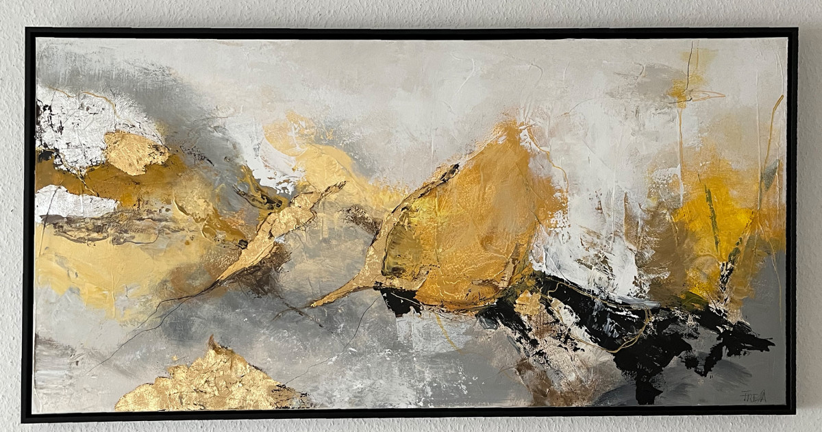 Das Gemälde HURRICANE verkörpert die Kraft und die Unberechenbarkeit eines gewaltigen Sturms. Mit Ocker-Farbtönen und Blattgold auf weiss-grauem, teils schwarzem Hintergrund setzt FREJA das Chaos und die gleichzeitige Schönheit des Wetterphänomens in Szene.