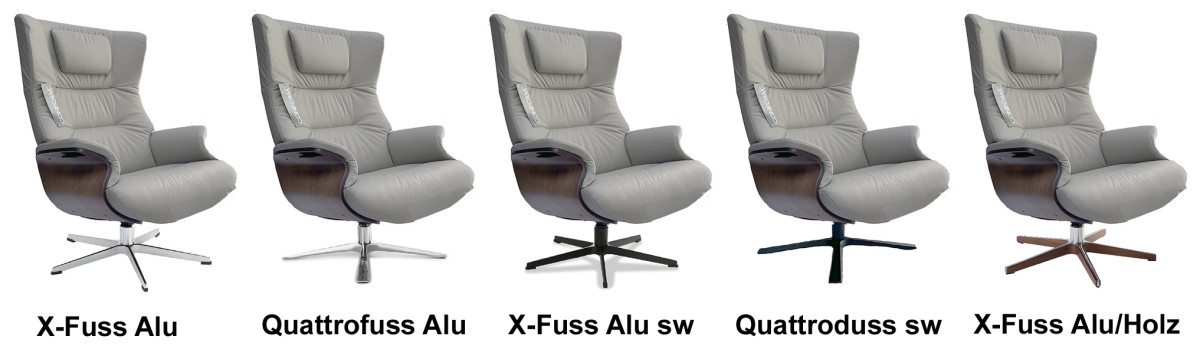 Der Sessel kann wahlweise mit dem X-Fuss (5 Ausleger) oder Quattro-Fuss (4 Ausleger), in den Oberflächen Aluminium oder matt-schwarz lackiert ausgestattet werden. Außerdem besteht die Möblichkeit einer Sitzhöhenanpassung um 3,5cm. Alle angebotenen Sesselfüsse ermöglichen ein Drehen des Sessels um 360° und verfügen über eine Memory-Return-Funktion, die den Sessel nach der Benutzung in die Ursprungspostion zurückdreht.