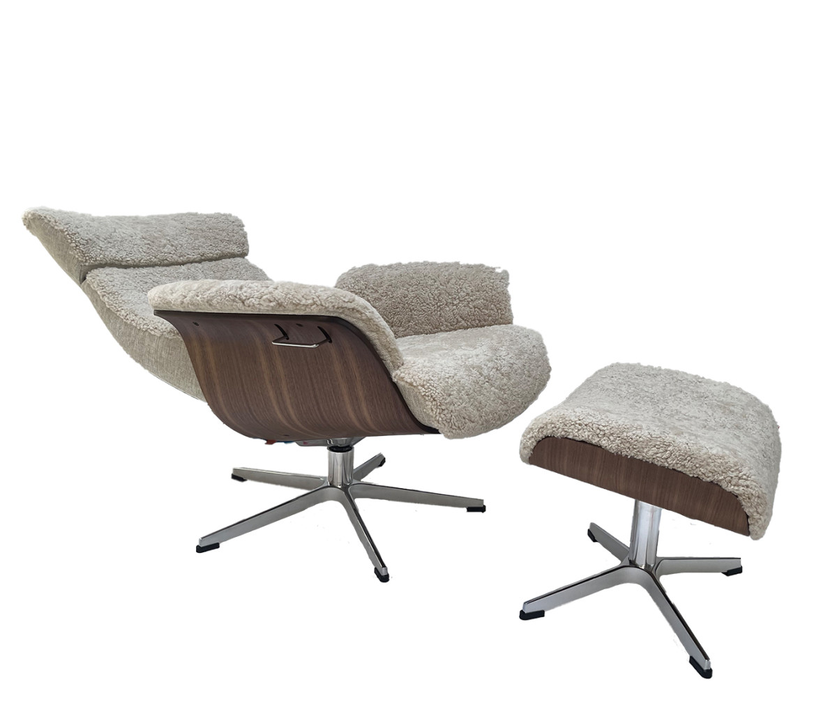 Eine besonders natürliche Ausführung des Relaxsessel TIMEOUT mit Hocker ist die Konfiguration mit Sitzschale aus Walnussholz, in Kombination mit sandfarbenem Schaffell, dem Bezugsstoff ARTS Birch. Farblich sehr harmonisch aufeinander abgestimmt, kommen die Materialien sehr schön zur Geltung.