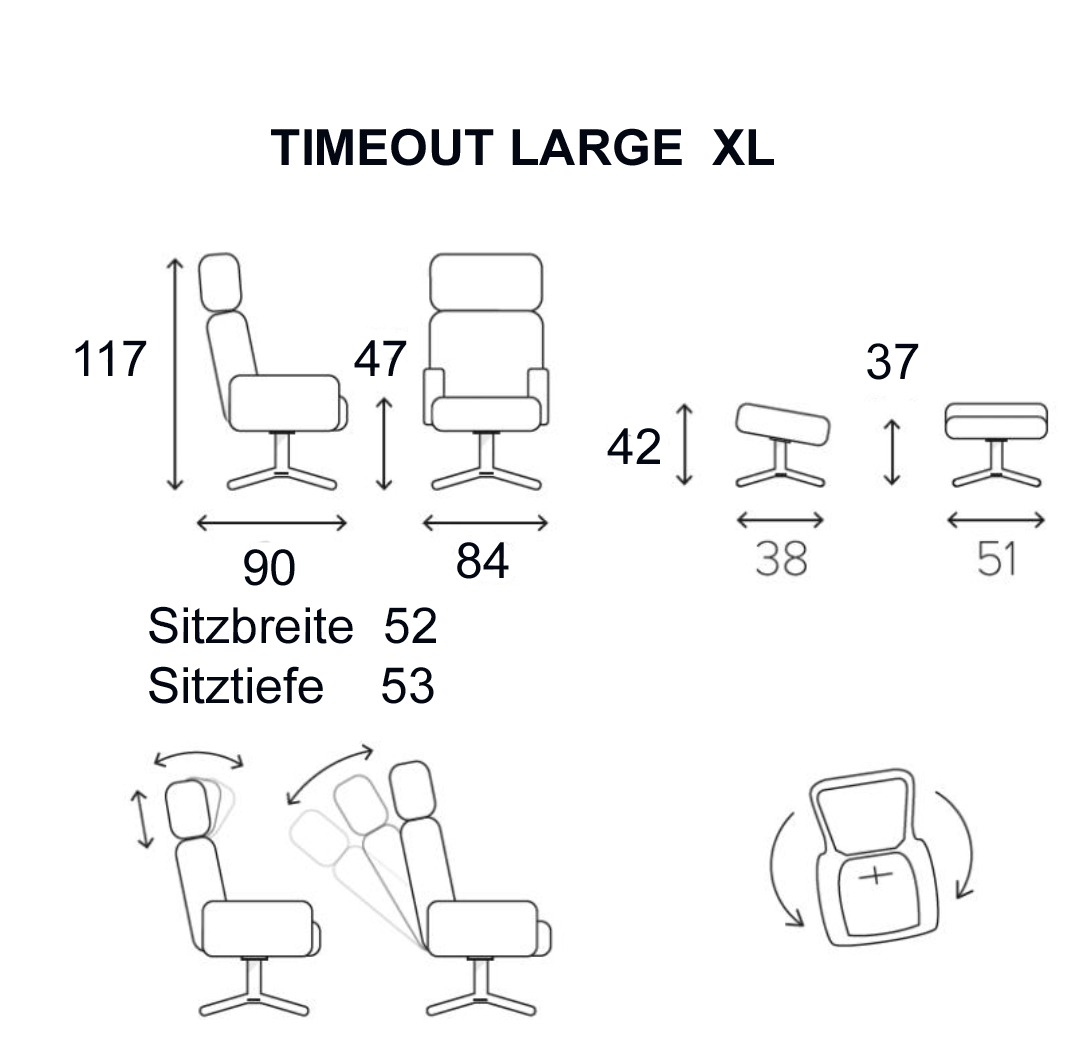 Die hier gezeigte Ausführung ist die größte verfügbare Variante des seit vielen Jahren bekannten TIMEOUT Relaxsessels. Die Sitzflache ist 4 cm breiter und 3cm tiefer, als beim TIMEOUT und TIMEOUT XL. Der TIMEOUT LARGE XL verfügt über die gleichen Funktionen wie seine Vorgänger und ist für Personen mit einer Körpergröße >189cm und einem Gewicht bis 140 kg ausgelegt. Geniessen Sie die neue Großzügigkeit des TIMEOUT- LARGE-Relaxsessels. Sollten Sie kleiner als 189cm und größer als 182cm sein, empfehlen wir Ihnen den TIMEOUT LARGE in Standardhöhe oder den schmaler geschnittenen TIMEOUT XL, die beide über die identische Rückenlänge verfügen. Bei einer Körpergröße bis 182cm wechseln Sie bitte zum