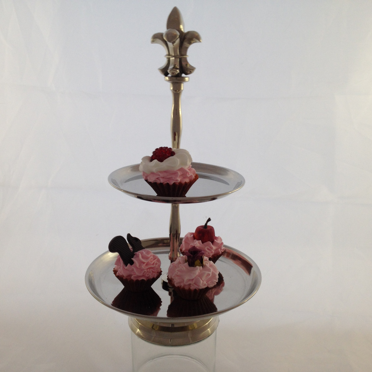 Sie sehen eine 2-stufige Etagère auf Fuß, mit einem zentrisch befestigten, dekorativen Stab. Die Spitze des Stabes ziert eine frz. Lilie. Die Etagère ist ein schönes Accessoire um Ihren Gästen Gebäck zur Kaffee-/ Teestunde zu reichen. Sie ist vernickelt und damit leicht zu pflegen.