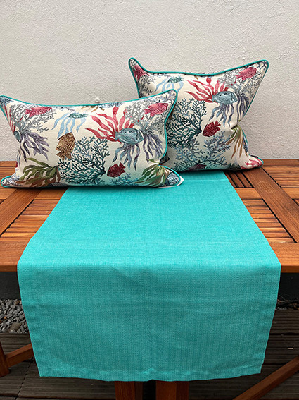 der Tischläufer MIKA ist mit seinem kräftigen Türkis eine perfekte Ergänzung zu den Kissenhüllen MARE, die einen Mika-Keder tragen. Unser Tischläufer hat eine Breite von 50cm, ist 150cm lang und trägt einen umlaufenden Breitsaum.